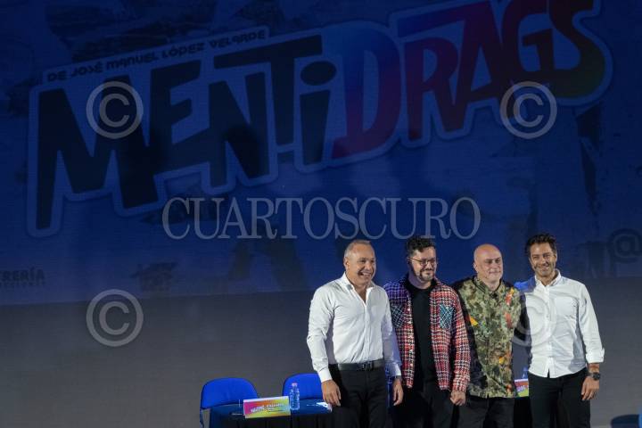 Parte del elenco y el productor Oscar Carnicero durante la presentación de la aplicación para teléfonos inteligentes de la producción de Mentiras, que comprende Mentiras el Musical, el Concierto y Mentidrags; en el Teatro Aldama.
