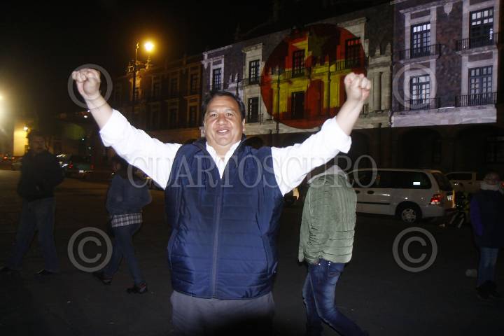 TOLUCA, ESTADO DE MÉXICO, 03ABRIL2017.- El candidato a la gubernatura del Estado de México por el Partio del Trabajo, Oscar Gonzalez Yáñez, inició su campaña en la plaza de los Mártires de la capital mexiquense, proyectando la imagen del partido en Palacio de Gobierno. FOTO: ARTEMIO GUERRA BAZ /CUARTOSCURO.COM