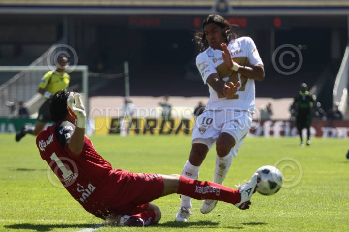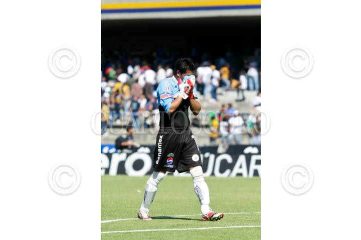 MÉXICO, D.F., 25ENERO2009.- Oswaldo Sánchez, portero de Santos Laguna se lanza al lado contrario de donde el delantero de Pumas, Martín Bravo, tiró el penal con el que los de la UNAM vencieron 1-0 a los laguneros en partido de la Jornada 2 del torneo Clausura 2009, disputado en el estadio de Ciudad Universitaria. FOTO: ISAAC ESQUIVEL/CUARTOSCURO.COM