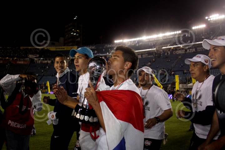 MÉXICO, D.F., 13DICIEMBRE2009.- Oswaldo Martínez en festejo besa el trofeo del campeon de torneo de Apertura 2009, tras vencer a la Máquina cementera en su casa con un marcador global de 6-4. FOTO: SÁSHENKA GUTIÉRREZ/CUARTOSCURO.COM