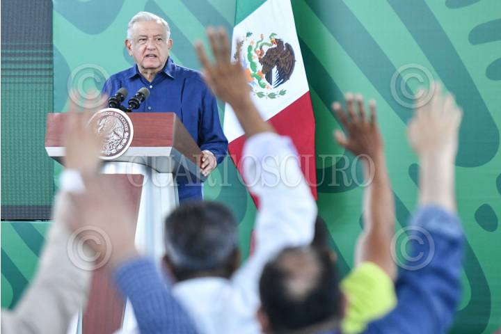 ACAPULCO, GUERRERO, 20DICIEMBRE2023.- Andrés Manuel López Obrador, presidente de México, durante conferencia de prensa matutina realizada en la 12 Región Naval, en la que se mostraron los avances en la reconstrucción de Acapulco a 57 días del paso del huracán Otis. FOTO: MARIO JASSO/CUARTOSCURO.COM