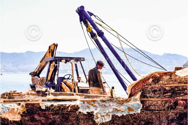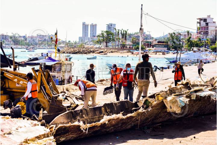ACAPULCO, GUERRERO. 31ENERO2024.- Luego de tres meses del paso del huracán Otis en el puerto de Acapulco, aún se observan restos de embarcaciones sobre el malecón y en playas, los cuáles ya empiezan a ser retirados por una brigada de trabajadores del Centro de Atención y Proteccion al Turista, para dar una mejor imagen a los visitantes. FOTO: CARLOS CARBAJAL/CUARTOSCURO.COM
