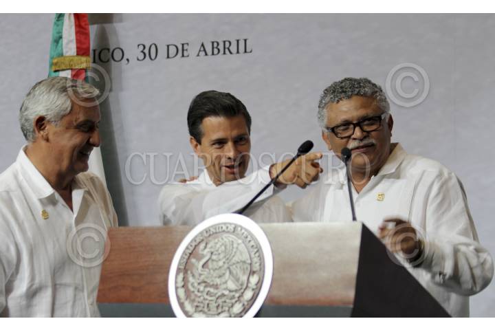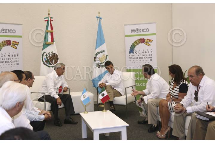 MÉRIDA, YUCATÁN, 30ABRIL2014.- En un mensaje a los medios de comunicación, acompañado por su homólogo de Guatemala, Otto Pérez Molina, y el Secretario General de la Asociación de Estados del Caribe, Alfonso Múnera, el Primer Mandatario, Enrique Peña Nieto reafirmó el compromiso y convicción de hermandad y fraternidad de México con las naciones del Caribe. FOTO: PRESIDENCIA /CUARTOSCURO.COM