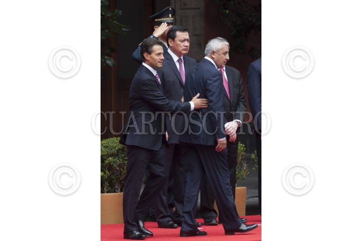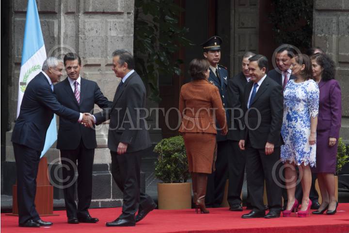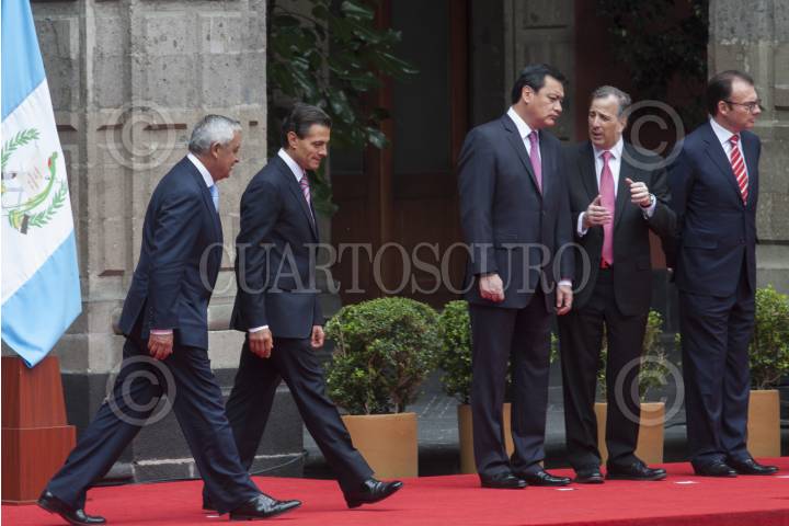 MÉXICO, D.F., 13MARZO2015.- Otto Pérez Molina, Presidente de Guatemala y Enrique Peña Nieto, Presidente de México, durante la recepción oficial que le brindo el mandatario mexicano en el Palacio Nacional. En la imagen se observan a los funcionarios nacionales Miguel Ángel OsorioChong, secretario de Gobernación, José Antonio Mead, secretario de Relaciones Exteriores y Luis Videgaray, secretario de Hacienda. FOTO: MOISÉS PABLO /CUARTOSCURO.COM