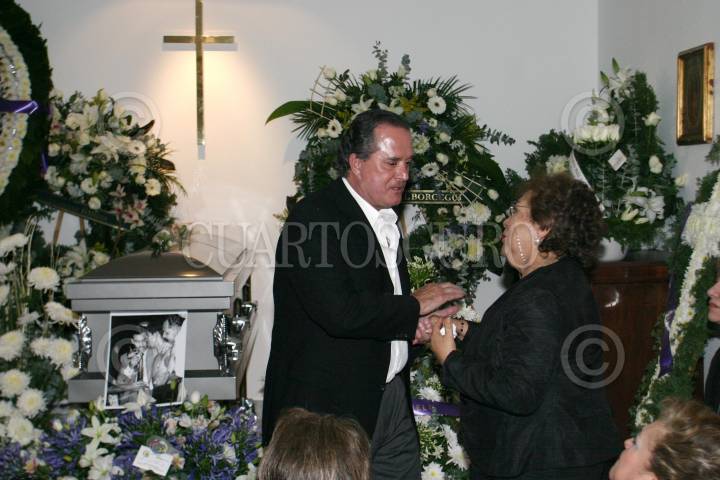 MEXICO, D.f., 23MAYO2006.- El cronista deportivo Angel Fernandez, murió a los 80 años esta madrugada a causa de un paro respiratorio, sus restos son velados en una funeraria de Felix Cuevas. En la imagen Raúl Ovarñanos le da el pesame a la viuda Lucrecia Gris de Fernández. FOTO: Moisés Pablo/CUARTOSCURO.COM