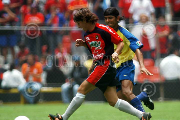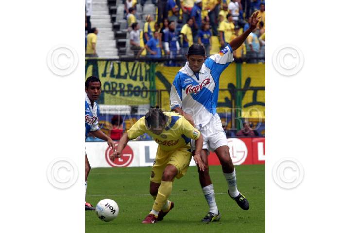 MEXICO, D.F. 12 SEPTIEMBRE2004.- Reinaldo Navia, de las Águilas del América y Franky Oviedo del equipo de Puebla se disputan el balón en su encuentro en el Estadio Azteca. Con un marcador 1 a 0 favor Puebla. FOTO:Sandra Perdomo/CUARTOSCURO.COM