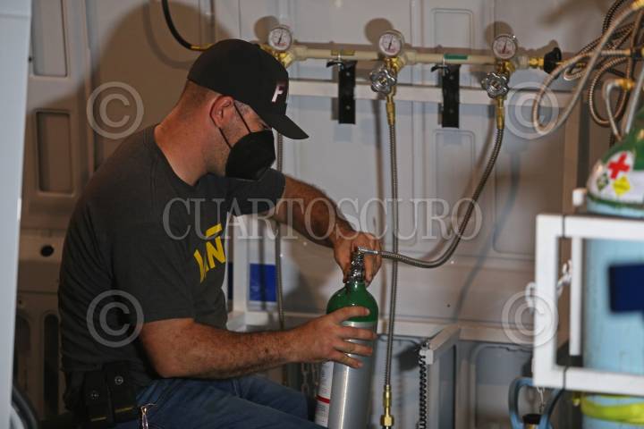 Una persona que colabora con el proyecto Oxigeno en Ruedas, rellena uno de los tanques de personas que acuden a recibir el apoyo que ofrecen a domicilio.