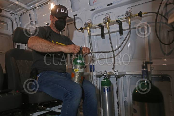 Una persona hace fila para recibir el apoyo de rellenado de tanques de oxigeno que ofrecen el grupo conformado por Oxigeno en Ruedas.