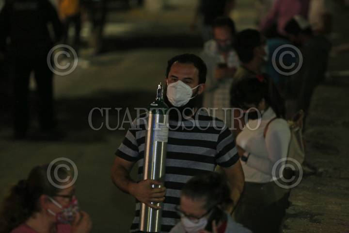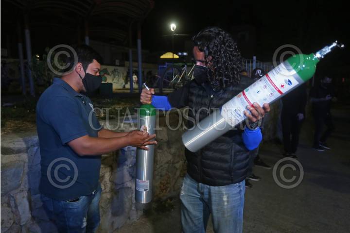 Decenas de personas hacen fila para rellenar sus tanques de oxigeno para sus familiares contagiados por SARS-CoV-2, esto en la explanada del parque San Jacinto.