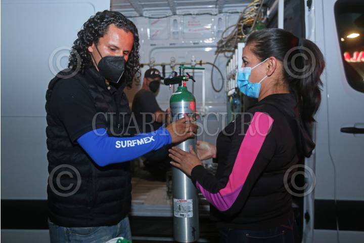 Una persona que colabora con el proyecto Oxigeno en Ruedas, recibe un tanque para posteriormente ser rellenado de una persona que acudió a recibir el apoyo que ofrecen a domicilio.