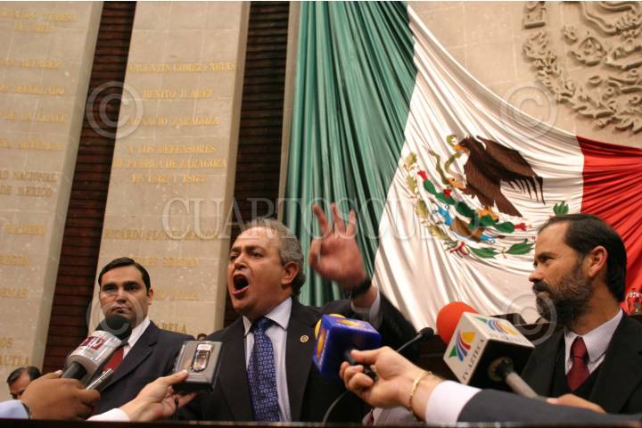 MEXICO, D.F. 16NOVIEMBRE2004.- Ozuna Millán (PAN), y Gustavo Madero (PAN) se subieron a la tribuna de la Cámara de Diputados en protesta a la que califican flata de diálogo con las fuerzas políticas de oposición en torno a la discusión del presupuesto de egresos 2004. FOTO:Moisés Pablo/CUARTOSCURO.COM