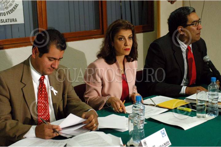 MEXICO, D.F. 18ABRIL2005.- En conferencia de prensa, los diputados Obdulio Ávila (PAN) y Mauricio López (PRI), acompañados de la integrante del consejo de información y transparencia María Elena Pérez-Jaen; dónde acusaron a la PGJDF y a la ALDF por el uso faccioso para reformar la ley de transparencia., así como del hostigamiento de que ha sido la consejera. FOTO: CUARTOSCURO.COM