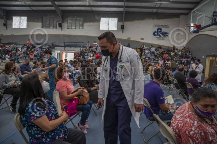 Personal médico aplica la vacuna P-fizer en la Preparatoria Federal Lázaro Cardenas de Tijuana
