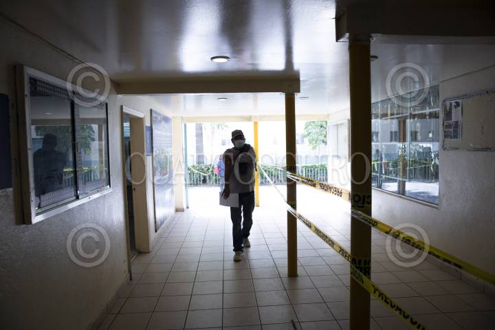 Un hombre camina a la sala de observación después de aplicarse la vacuna P-fizer en la Preparatoria Federal Lázaro Cardenas de Tijuana