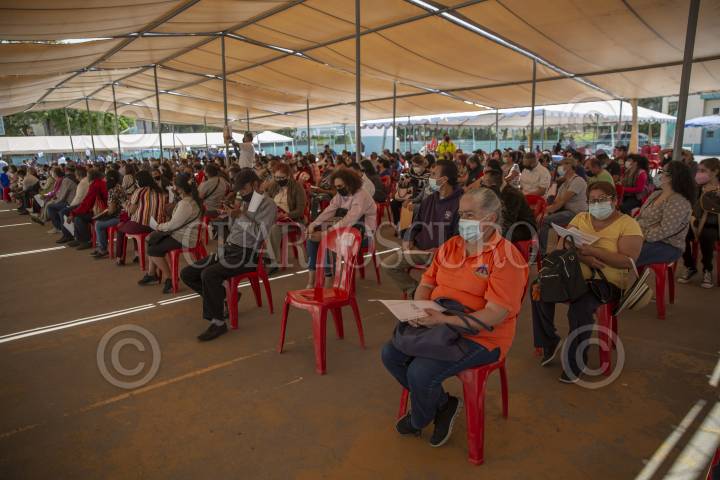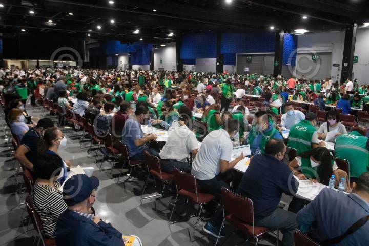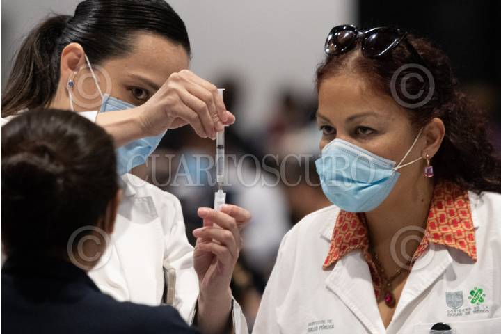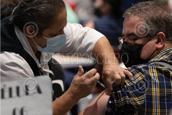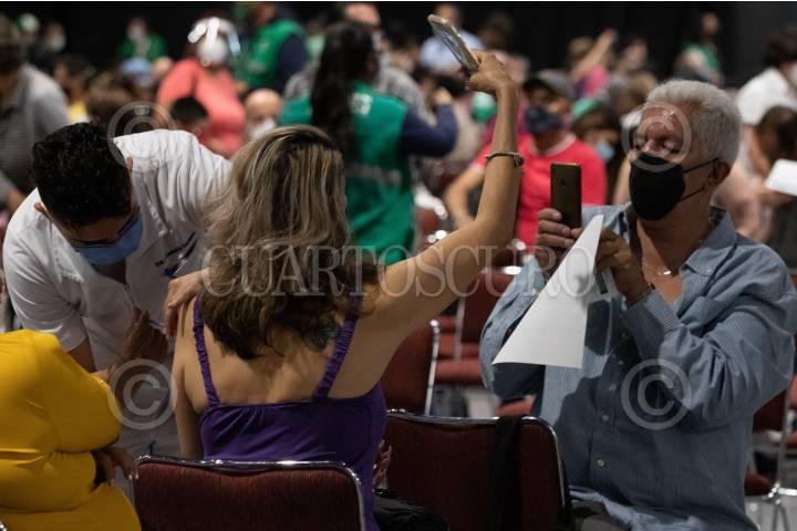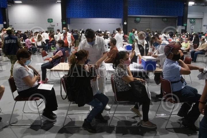 Adultos entre 50 y 59 años de edad acudieron a recibir la primera dosis de vacuna P-fizer en el Pepsi Center WTC