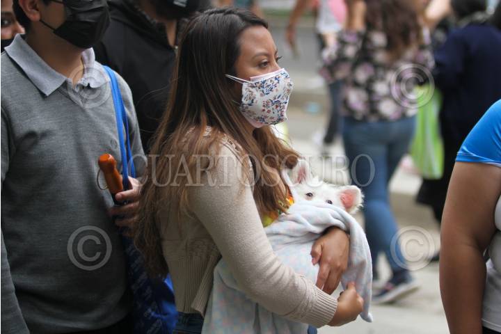 Una mujer carga a su perro mientras espera en la fila para recibir su primera dosis de la vacuna P-fizer contra Covid-19 en la Deportiva Xochimilco