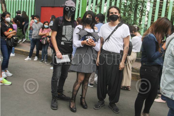 Jóvenes disfrazados acudieron a la convocatoria de asistir con un disfraz al recibir su primera dosis de la vacuna P-fizer contra Covid-19 en la Deportiva Xochimilco