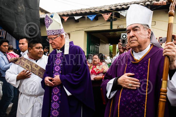 SAN ANDRES LARRAINZAR, CHIAPAS, 21OCTUBRE2024.- Los obispos Rodrigo Aguilar Martínez, Diócesis de San Cristóbal, y Felipe Arizmendi Esquivel, se dieron cita en el parque central de la cabecera municipal para oficiar una misa de cuerpo presente en honor al Padre Marcelo quien fue asesinado por impactos de bala en el barrio Cuxtitali de San Cristóbal de las Casas. FOTO: ISABEL MATEOS /CUARTOSCURO.COM
