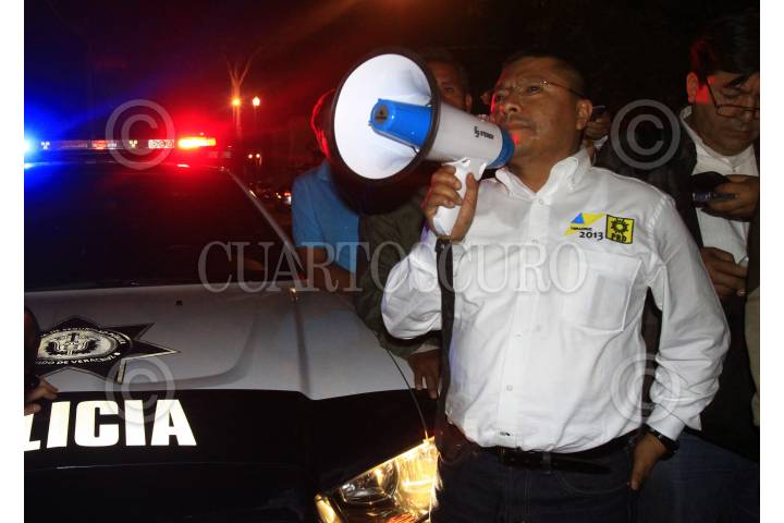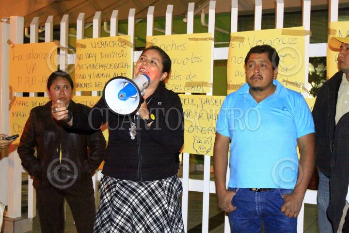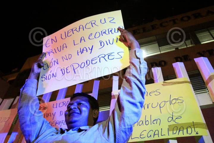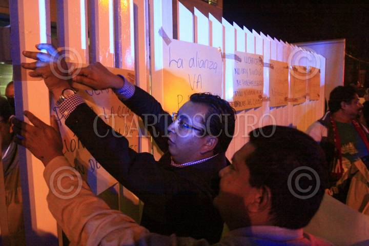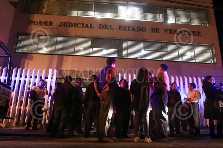XALAPA, VERACRUZ, 19FEBRERO2013.- Debido a que los magistrados de el Tribunal Electoral del Estado de Veracruz, anularon la "Gran Alianza Por Ti" conformada por el PAN y el PRD, por considerar que el Partido de la Revolución Democrática incumplió con sus estatutos; entre pancartas y gritos, militantes inconformes de ambos partidos se manifestaron a las afueras de el tribunal la noche de ayer. FOTO: TONA NAVARRO /CUARTOSCURO.COM