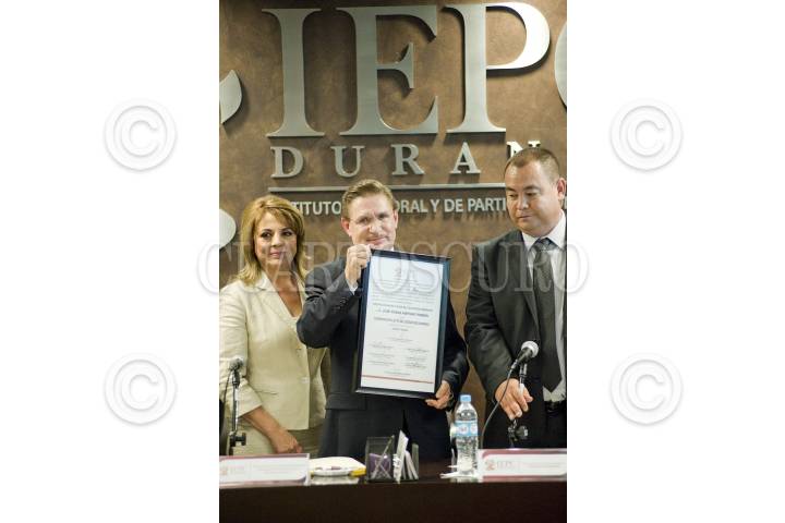 DURANGO, DURANGO, 15JUNIO2016.- El día de hoy el consejero presidente del Instituto Electoral y de Participación Ciudadana del Estado de Durango Juan Enrique Kato Rodríguez, entrego la constancia de mayoría que acredita a José Rosas Aispuro Torres como Gobernador Electo del pasado proceso electoral, el cual estuvo acompañado por su familia, y José Ramón Enríquez presidente municipal electo. FOTO: OCTAVIO ZALDIVAR /CUARTOSCURO.COM