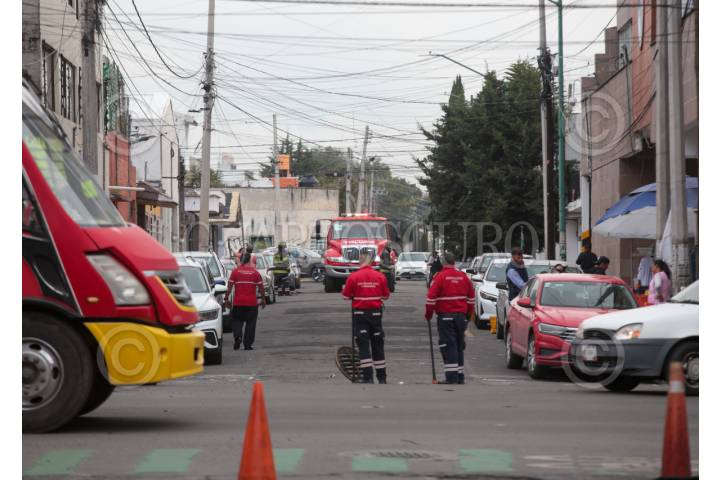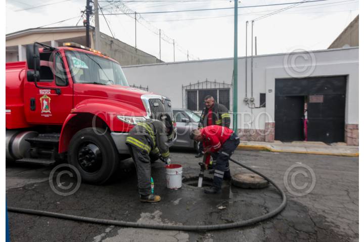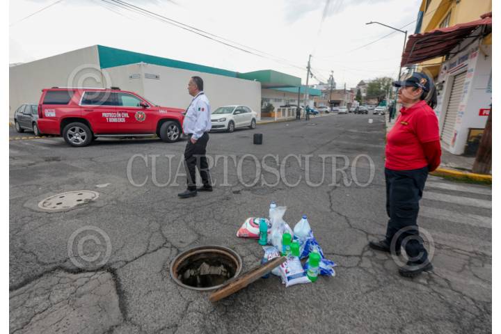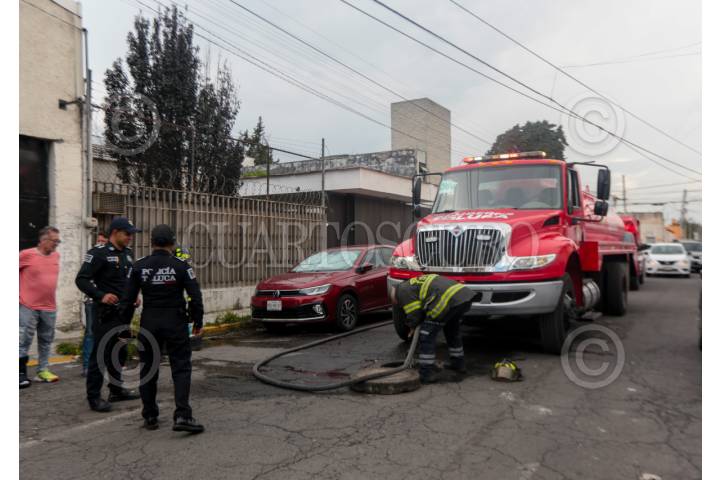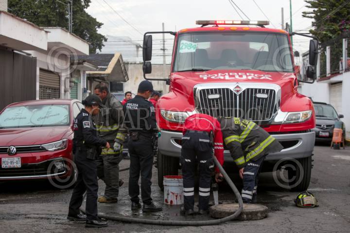TOLUCA, ESTADO DE MÉXICO, 11AGOSTO2025.- Elementos de PC y Bomberos de Toluca cerraron al menos tres cuadras de la colonia Vértice, por el reporte de un olor inusual a gas, procediendo a una revisión en los diferentes domicilios, revisión y lavado de drenaje para descartar fugas o acumulaciones que puedan representar algún riesgo. FOTO: CRISANTA ESPINOSA AGUILAR/CUARTOSCURO.COM