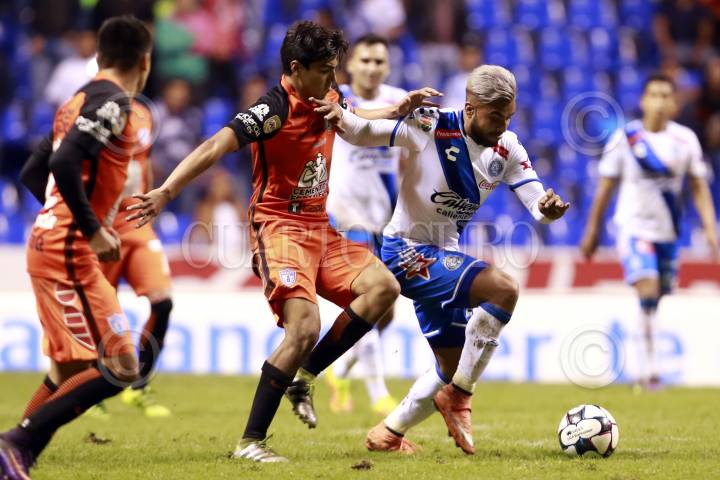 PUEBLA, 02OCTUBRE2016.- Los jugadores Pedro Canelo del Puebla y Erick Aguirre del Pachuca pelean el balón durante jugada del partido empatado 1-1 entre el Club Puebla y el Club Pachuca correspondiente a la jornada 12 del torneo apertura 2016 de la liga MX celebrado en el estadio Cuauhtémoc. FOTO: HILDA RÍOS/CUARTOSCURO.COM