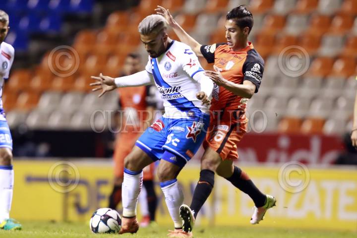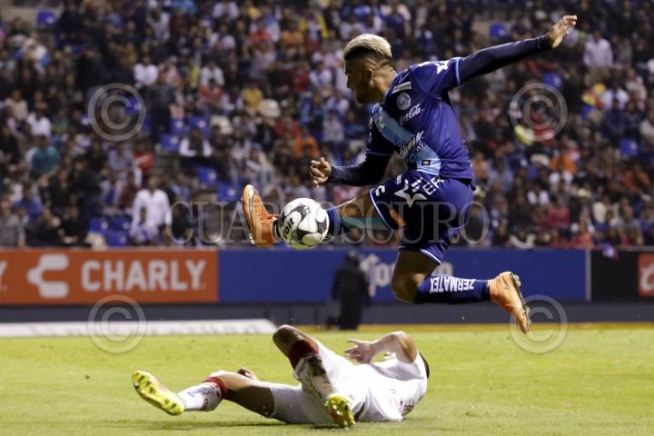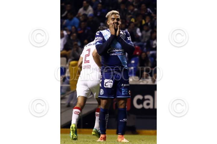 PUEBLA, PUEBLA, 19OCTUBRE2016.- Los jugadores Pedro Canelo y Jordan Silva durante jugada del partido de cuartos de final de la Copa MX entre el Club Puebla y los Diablos Rojos de Toluca con marcador final 0-2 celebrado en el estadio Cuauhtémoc. FOTO: HILDA RÍOS /CUARTOSCURO.COM