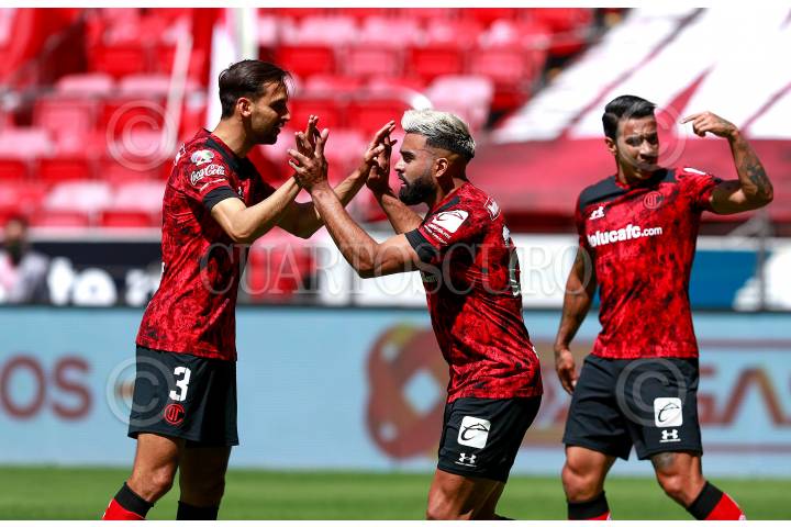 Michael Estrada, Pedro Canelo y Kevin Castañeda jugadores de los Diablos Rojos del Toluca celebran durante el encuentro ante Gallos Blancos de Queretaro, con un marcador final 3-1.