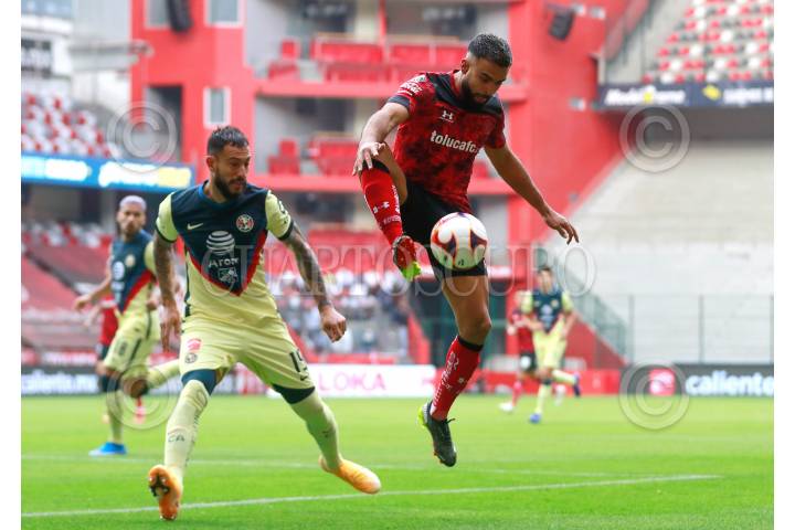 Pedro Canelo delantero de los Diablos Rojos del Toluca y Victor Aguilera defensa de las Águilas del América durante el encuentro en el estadio Nemesio Diez, con un marcador final 3-1.