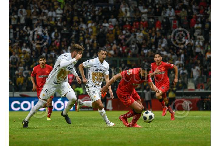 Pedro Canelo delantero de los Diablos Rojos del Toluca ante jugadores Pumas de la UNAM buscando su pase a Cuartos de Final del Torneo Grita México Apertura 2021.