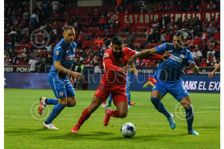 Pedro Canelo delantero de los Diablos del Toluca pelea es esférico con Julio Dominguez defensa de La Máquina Cementera del Cruz Azul, quienes logró la victoria en el estadio Nemesio Diez, derrotando al Club Toluca con un marcador final 1-4.