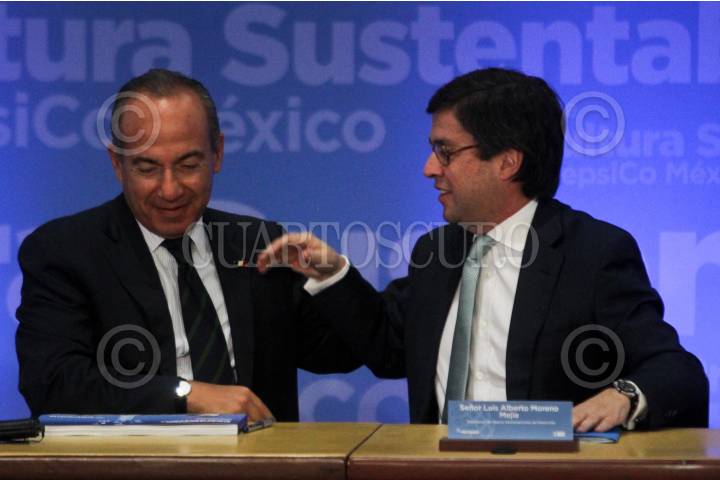 MÉXICO, D.F., 22FEBRERO2011.- Felipe Calderon, Presidente de México junto a Luis Alberto Moreno Mejia,Presidente del Banco Interamericano de Desarrollo durante la firma de convenios entre PepsiCo y el Banco Internacional de Desarrollo. FOTO: ENRIQUE ORDÓÑEZ/CUARTOSCURO.COM