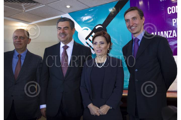 CIUDAD DE MÉXICO, 27JUNIO2016.- Francisco Merino, vicepresidente jurídico y de asuntos de gobierno de PepsiCo; Pedro Padierna Bartning, presidente de PepsiCo México; José Antonio Meade, secretario de Desarrollo Social, y Susan Pick, fundadora de Yo quiero Yo puedo, durante la firma de declaración conjunta entre la Sedesol y PepsiCo "Por un México Incluyente". FOTO: MOISÉS PABLO /CUARTOSCURO.COM