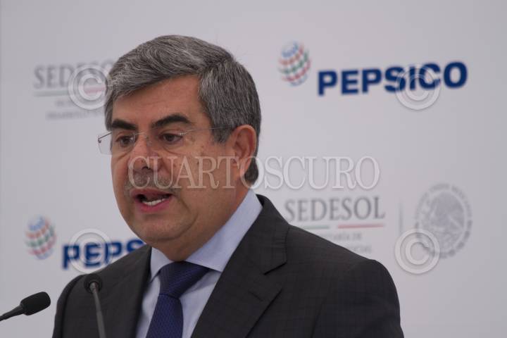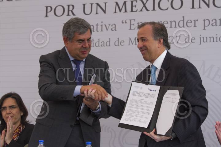 CIUDAD DE MÉXICO, 27JUNIO2016.- Pedro Padierna Bartning, presidente de PepsiCo México, y José Antonio Meade, secretario de Desarrollo Social, durante la firma de declaración conjunta entre la Sedesol y PepsiCo "Por un México Incluyente". FOTO: MOISÉS PABLO /CUARTOSCURO.COM