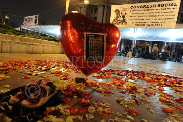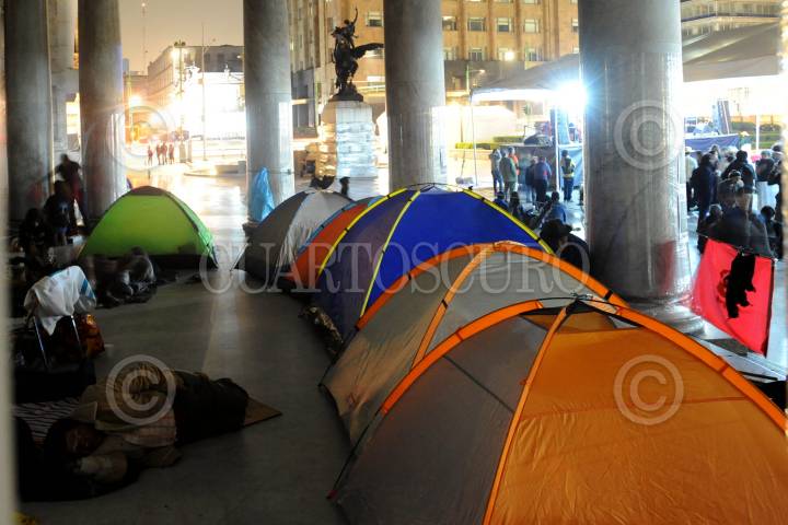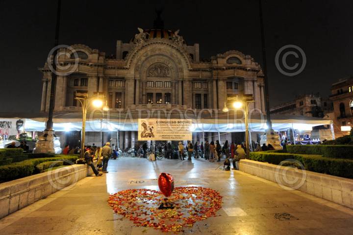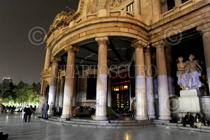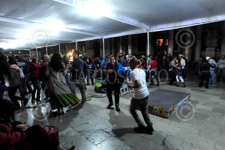 MÉXICO .F., 27JUNIO2015.- Familiares y amigos del movimiento 43 de Ayotzinapa, pasaron la velada bailando en las inmediaciones del Palacio de Bellas Artes, acompañados de un grupo musical. Algunos decidieron dormir en el campamento montado en la entrada de este lugar. FOTO: LUIS CARBAYO /CUARTOSCURO.COM
