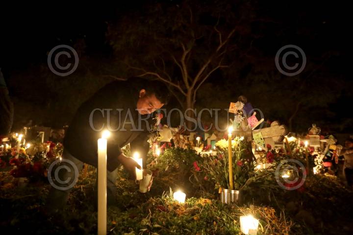SAN JUAN IXCAQUIXTLA, PUEBLA, 02NOVIEMBRE2016.- Como cada año, cientos de pobladores del municipio de San Juan Ixcaquixtla, Puebla; acuden al panteón para acompañar a sus difuntos durante su visita al mundo de los vivos con música, comida y bebida hasta el amanecer. FOTO: HILDA RÍOS /CUARTOSCURO.COM