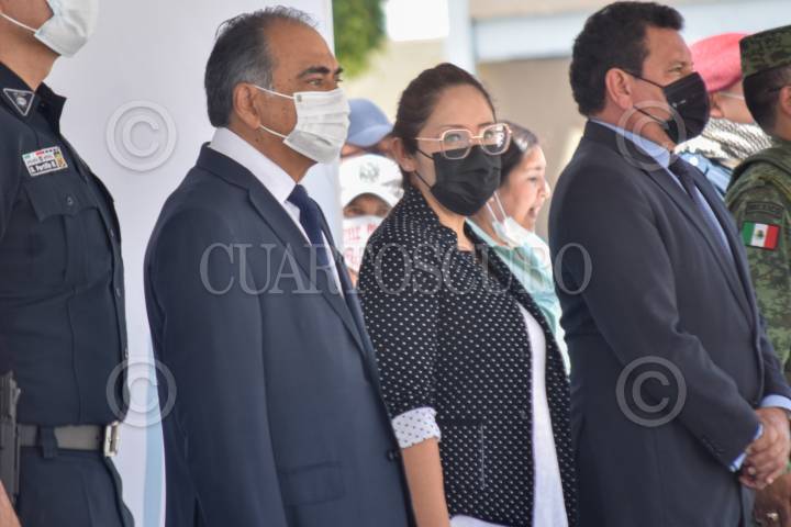 Héctor Astudillo, gobernador de Guerrero, y Sandra Velázquez, presidenta municipal de Pilcaya, durante el homenaje a los policías que murieron durante un ataque armado dirigido a la segunda.