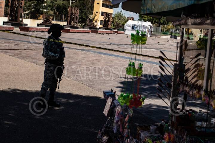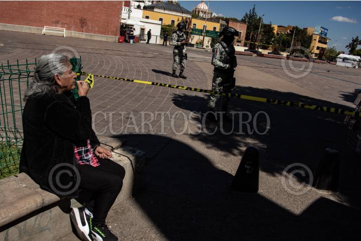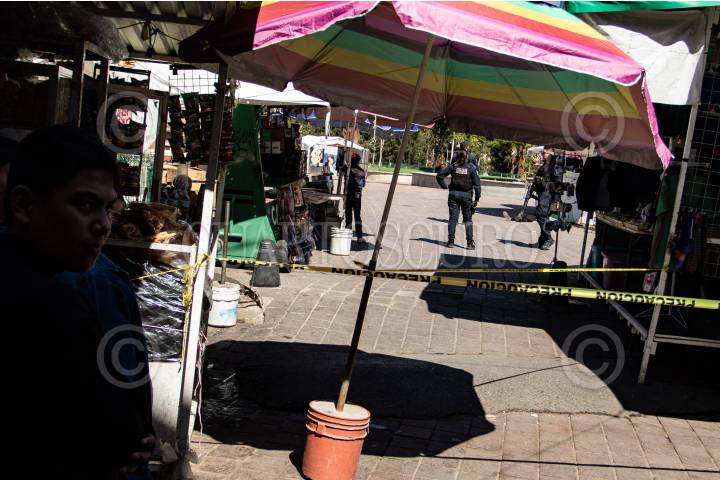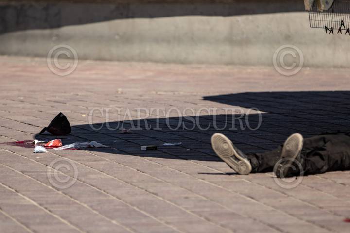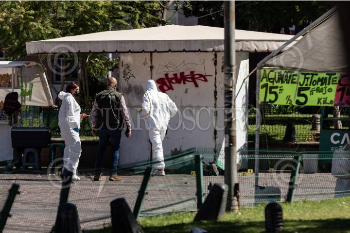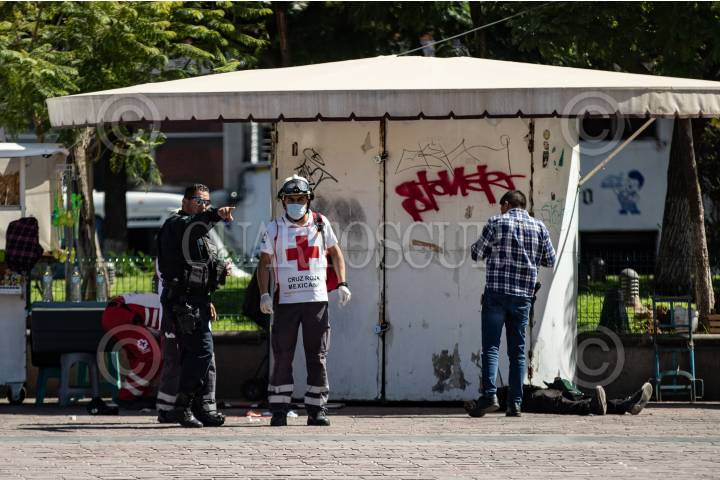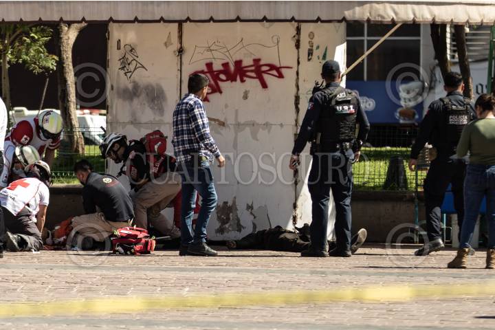 ZACATECAS, ZACATECAS, 13OCTUBRE2024.- Dos jóvenes fueron atacados cuando se encontraban junto a un puesto de fritangas en la Plaza Bicentenario, plaza de mayor transito peatonal de la ciudad. Alrededor de las 14:00 hrs, fueron reportadas detonaciones de arma de fuego en la zona, decenas de comerciantes y peatones se acercaron al lugar en donde dos jóvenes, de alrededor de 20 años, se encontraban tirados en el suelo y ambos con heridas de bala en la cabeza. Al lugar llegaron policías municipales y paramédicos de Cruz Roja, quienes al realizar la valoración, una de las víctimas ya no contaba con signos vitales. El otro joven fue trasladado de gravedad a un hospital cercano. Mas tarde, la Secretaria de Seguridad Pública, informó de los hechos en un escueto comunicado, donde informaron del aumento de seguridad en la zona y prestando mayor importancia a la presunta venta de drogas y criminalización de los jóvenes atacados. FOTO: GENARO NATERA /CUARTOSCURO.COM