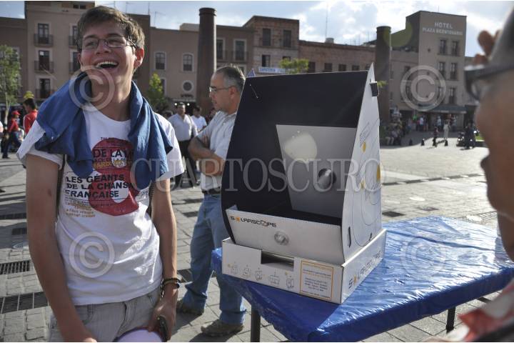 ZACATECAS, ZACATECAS, 05JUNIO2012.-Observación del tránsito del planeta Venus entre la Tierra y el Sol en la Plaza Bicentenario, en la que personal del Museo de Ciencias de la Universidad Autónoma de Zacatecas puso a disposición del público dispositivos para observarlo de manera segura. FOTO: JAIME ROBLEDO /CUARTOSCURO.COM