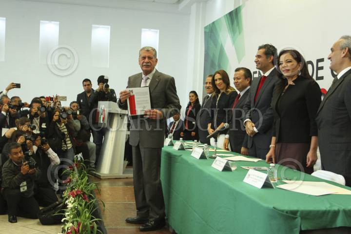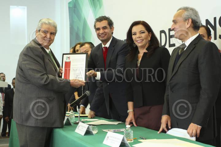 CIUDAD DE MÉXICO, 14SEPTIEMBRE2016.- Carlos Aceves del Olmo, recibe contancia como diputado constituyente de Enrique Reza Ochoa, presidente nacional del Partido Revolucionario Institucional, durante la ceremonia de entrega de constancias previo a la primera asamblea de la Asamblea Constituyente, realizado en la sede del PRI-DF. FOTO: ADOLFO VLADIMIR /CUARTOSCURO.COM