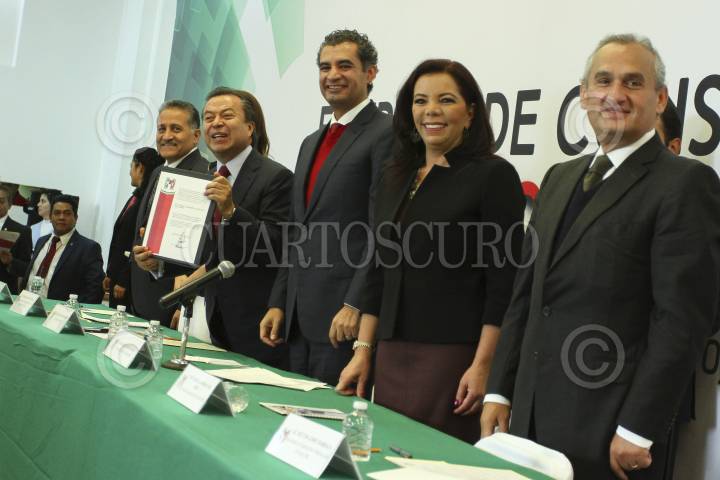 CIUDAD DE MÉXICO, 14SEPTIEMBRE2016.- César Camacho Quiroz, recibe contancia como diputado constituyente de Enrique Reza Ochoa, presidente nacional del Partido Revolucionario Institucional, durante la ceremonia de entrega de constancias previo a la primera asamblea de la Asamblea Constituyente, realizado en la sede del PRI-DF. FOTO: ADOLFO VLADIMIR /CUARTOSCURO.COM
