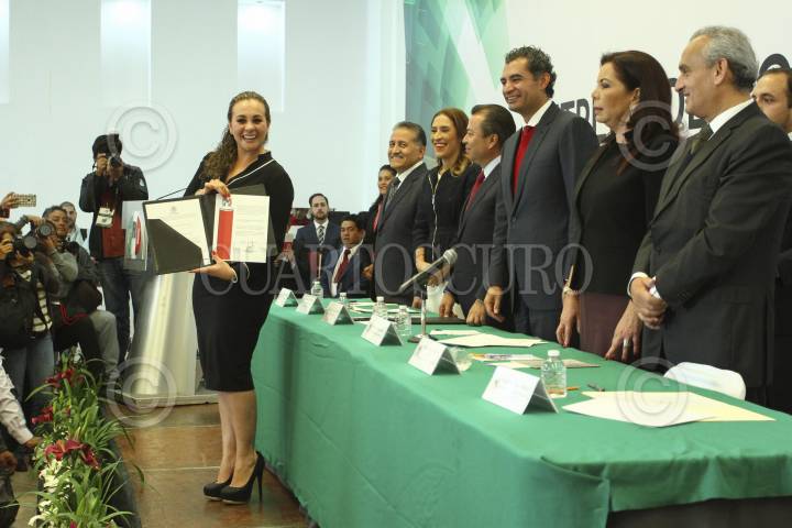 CIUDAD DE MÉXICO, 14SEPTIEMBRE2016.- María Fernanda Bayardo, recibe contancia como diputado constituyente de Enrique Reza Ochoa, presidente nacional del Partido Revolucionario Institucional, durante la ceremonia de entrega de constancias previo a la primera asamblea de la Asamblea Constituyente, realizado en la sede del PRI-DF. FOTO: ADOLFO VLADIMIR /CUARTOSCURO.COM