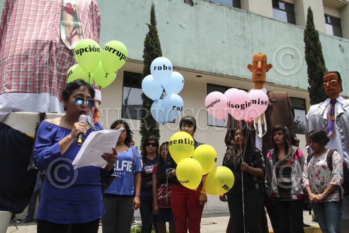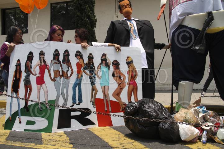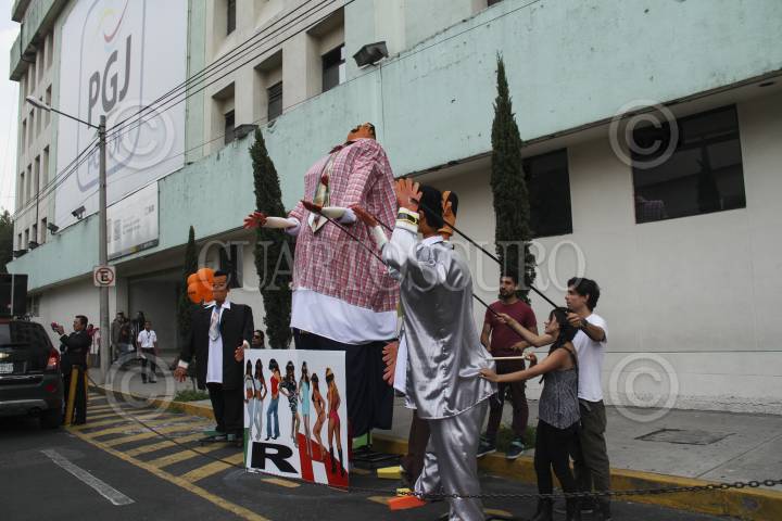 MÉXICO, D.F., 21JULIO2015.- Mujeres de diferentes organizaciones se manifestaron en las inmediaciones de la Procuraduría General de Justicia del Distrito Federal. Realizaron una representación con marionetas gigantes denunciando al ex presidente del PRI-D.F. Cuauhtémoc Gutierrez de la Torre, quien fue absuelto de dirigir una red de prostitución dentro de las instalaciones del partido del que fuera presidente. FOTO: ISABEL MATEOS /CUARTOSCURO.COM
