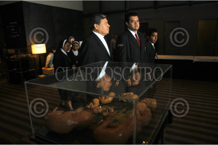 MÉXICO D.F. 25 MARZO2007.- El cardenal Norberto Rivera a su llegada al congreso internacional Pro-Vida pasa aun costado de una vitrina que contenia unos fetos de plastico, esto en un hotel en el centro de la ciudad. FOTO: GUILLERMO PEREA/CUARTOSCURO.COM