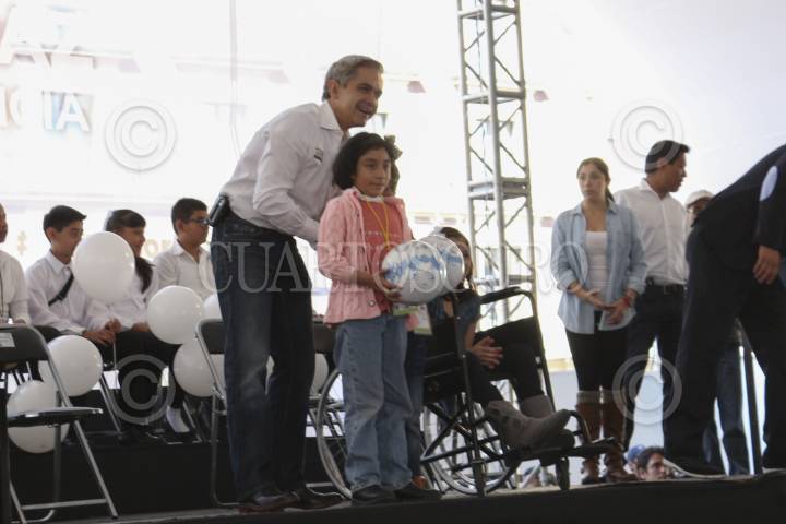 MEXICO, D.F., 16NOVIEMBRE2013.- Niños del Distrito Federal acudieron al evento organizado por el Non Violence Project para cambiar juguetes bélicos por balones de fútbol, llevado a cabo en el zócalo capitalino. En la foto, Miguel Mancera entrega los primeros balones en el intercambio por juguetes bélicos. FOTO: DAVID POLO /CUARTOSCURO.COM
