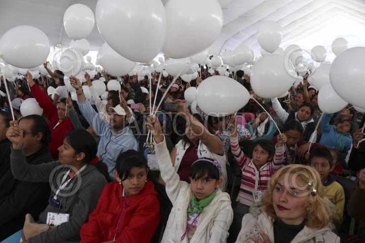 MEXICO, D.F., 16NOVIEMBRE2013.- Niños del Distrito Federal acudieron al evento organizado por el Non Violence Project para cambiar juguetes bélicos por balones de fútbol, llevado a cabo en el zócalo capitalino. Los asistentes llevaron globos blancos en símbolo de la paz. FOTO: DAVID POLO /CUARTOSCURO.COM