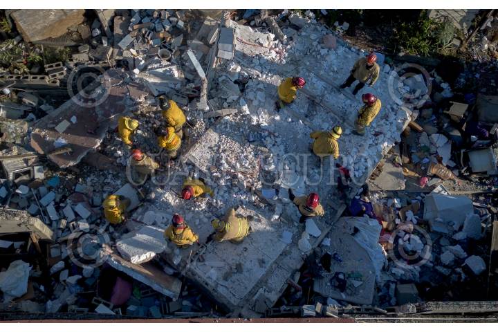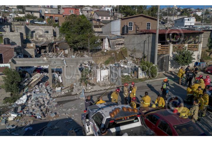 TIJUANA, BAJA CALIFORNIA, 20SEPTIEMBRE2023.- Bomberos y personal de Protección Civil trabajando en el lugar de la explosión, con la estructura de la casa que colapso de fondo. Una fuerte explosión que se registró en una casa habitación, dejó en total colapso la estructura, ubicada en la calle Sierra vizcaíno. En los escombros, elementos del Cuerpo de Bomberos, localizaron a dos cuerpos sin vida. Autoridades trabajaron arduamente durante horas con la búsqueda de otras personas, ya que de acuerdo con vecinos, en el lugar se encontraba toda la familia, sin embargo únicamente se hizo el hallazgo de esa pareja, una mujer y un hombre, ambos de la tercera edad. Personal de Protección Civil, Cruz Roja, FGE, Guardia Nacional, Policía Municipal y personal de UMAS fueron quienes atendieron el incidente. FOTO: OMAR MARTÍNEZ/ CUARTOSCURO.COM