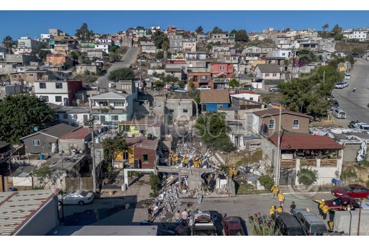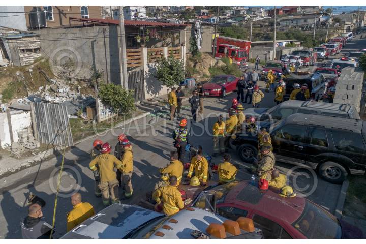 TIJUANA, BAJA CALIFORNIA, 20SEPTIEMBRE2023.- Imagen panorámica del lugar donde ocurrió la explosión con bomberos trabajando. Una fuerte explosión que se registró en una casa habitación, dejó en total colapso la estructura, ubicada en la calle Sierra vizcaíno. En los escombros, elementos del Cuerpo de Bomberos, localizaron a dos cuerpos sin vida. Autoridades trabajaron arduamente durante horas con la búsqueda de otras personas, ya que de acuerdo con vecinos, en el lugar se encontraba toda la familia, sin embargo únicamente se hizo el hallazgo de esa pareja, una mujer y un hombre, ambos de la tercera edad. Personal de Protección Civil, Cruz Roja, FGE, Guardia Nacional, Policía Municipal y personal de UMAS fueron quienes atendieron el incidente. FOTO: OMAR MARTÍNEZ/ CUARTOSCURO.COM