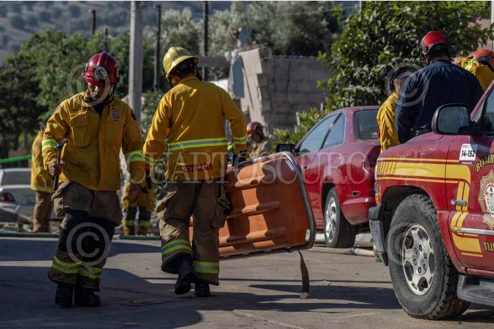 TIJUANA, BAJA CALIFORNIA, 20SEPTIEMBRE2023.- Bomberos en el lugar de la explosión. Una fuerte explosión que se registró en una casa habitación, dejó en total colapso la estructura, ubicada en la calle Sierra vizcaíno. En los escombros, elementos del Cuerpo de Bomberos, localizaron a dos cuerpos sin vida. Autoridades trabajaron arduamente durante horas con la búsqueda de otras personas, ya que de acuerdo con vecinos, en el lugar se encontraba toda la familia, sin embargo únicamente se hizo el hallazgo de esa pareja, una mujer y un hombre, ambos de la tercera edad. Personal de Protección Civil, Cruz Roja, FGE, Guardia Nacional, Policía Municipal y personal de UMAS fueron quienes atendieron el incidente. FOTO: OMAR MARTÍNEZ/ CUARTOSCURO.COM