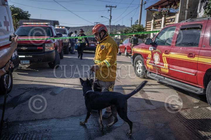TIJUANA, BAJA CALIFORNIA, 20SEPTIEMBRE2023.- Bombero con un k9 en la búsqueda por mas personas, tras el colapso de la vivienda en la explosión. Una fuerte explosión que se registró en una casa habitación, dejó en total colapso la estructura, ubicada en la calle Sierra vizcaíno. En los escombros, elementos del Cuerpo de Bomberos, localizaron a dos cuerpos sin vida. Autoridades trabajaron arduamente durante horas con la búsqueda de otras personas, ya que de acuerdo con vecinos, en el lugar se encontraba toda la familia, sin embargo únicamente se hizo el hallazgo de esa pareja, una mujer y un hombre, ambos de la tercera edad. Personal de Protección Civil, Cruz Roja, FGE, Guardia Nacional, Policía Municipal y personal de UMAS fueron quienes atendieron el incidente. FOTO: OMAR MARTÍNEZ/ CUARTOSCURO.COM